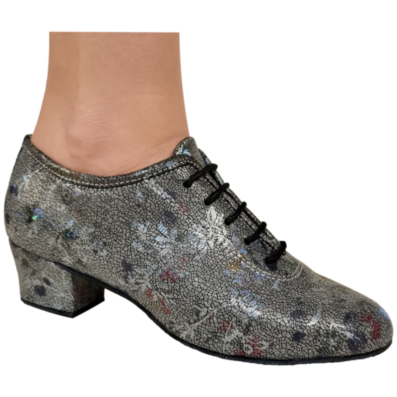Hel mockasula med 40 mm klack. Stabil modell. Tjock vadderad sula under trampdynan. Ovandel i grå textil med blommor som skimrar fint i regnbågens färger. En färg för dig som vill åt det lilla extra på dansgolvet! Se gärna videon längre ner för en bättre titt!